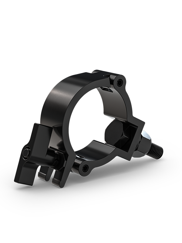Narrow anodized aluminum half-coupler clamp in black finish with threaded M12 bolt. Slim profile securely grips truss and adds versatility when mounting to truss systems. Fits standard 2 inch (50 mm) truss.
